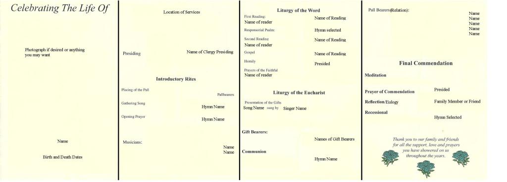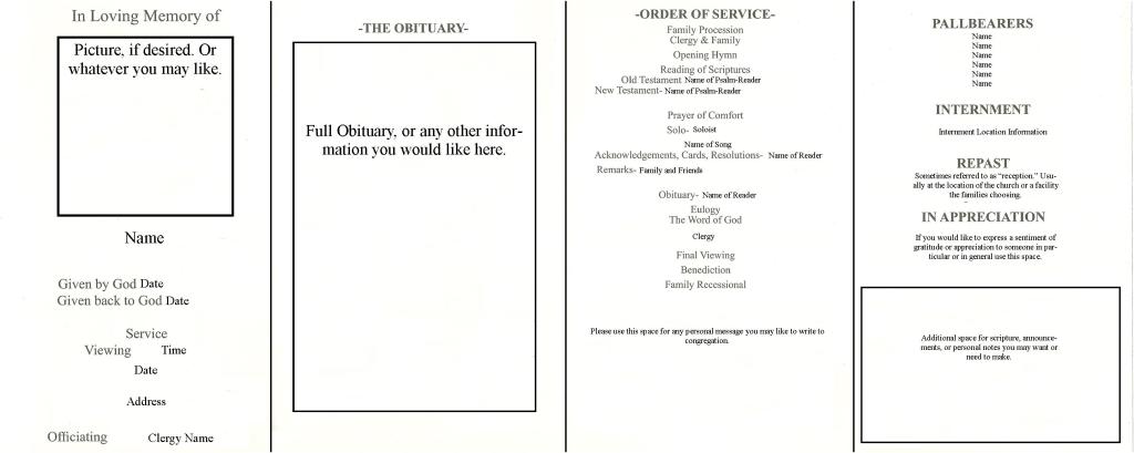 The following programs may be helpful when putting together a program for your funeral. Please click the small images below to view a full size view of the sample program.